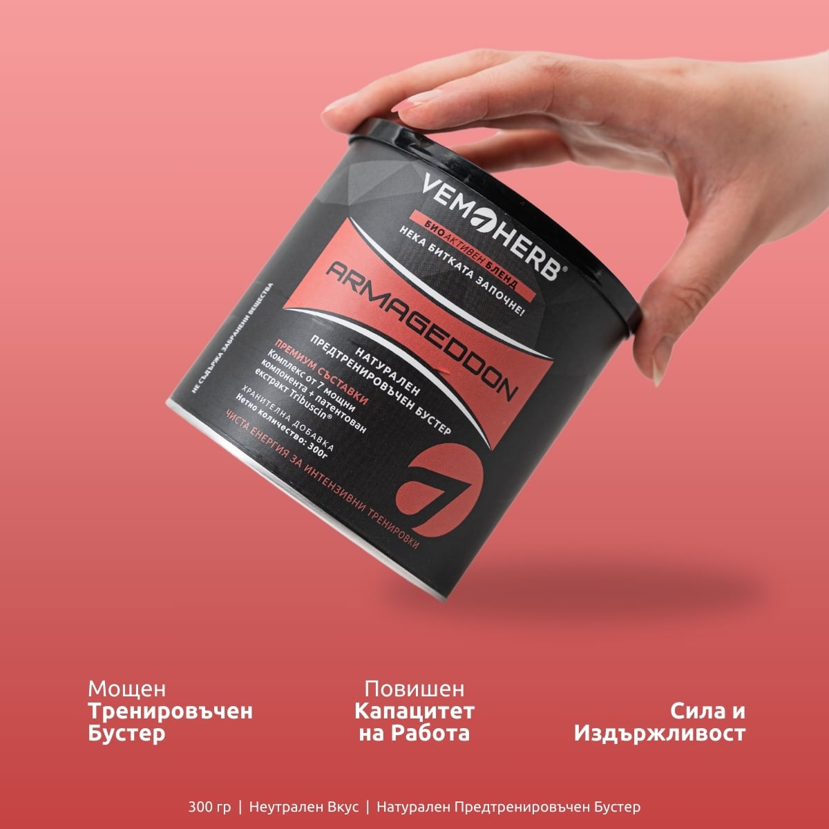 Предтренировъчен бустер Armageddon се предлага във флакони (300 г прах) и под формата на разтворима напитка (24 сашета). И двата ни варианта на VemoHerb Armageddon са 100% веган!