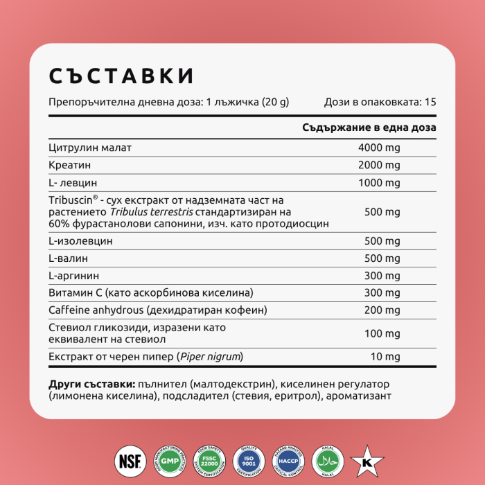 Предтренировъчен бустер с 8 мощни натурални съставки, вкл. Трибулус (>1800% сапонини), кофеин и аминокиселини