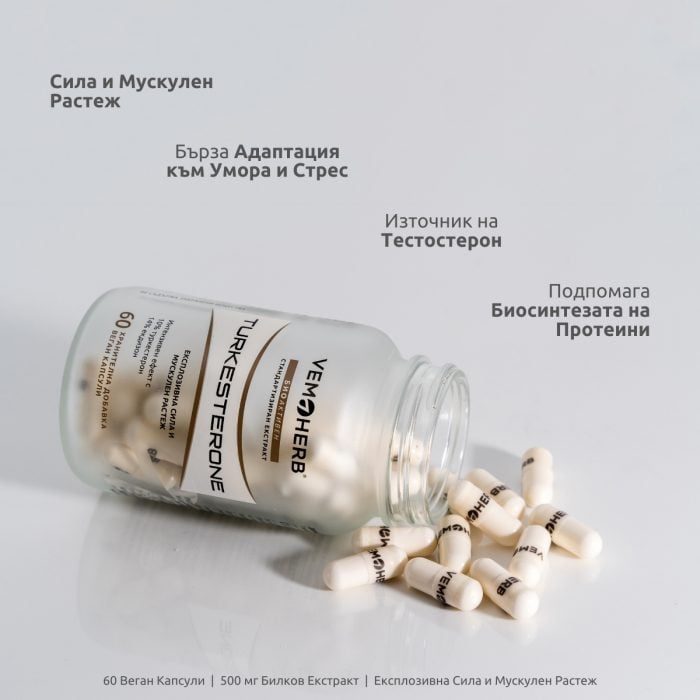 В същото време,VemoHerb®Turkesterone спомага при изгарянето на мазнините. Туркестеронът подпомага увеличаването на гликогеновите резерви в мускулите, които са пряко свързани с произвеждането на енергия, под формата на АТФ. Това ти позволява да тренираш по-усилено, без да усещаш толкова мускулна умора.