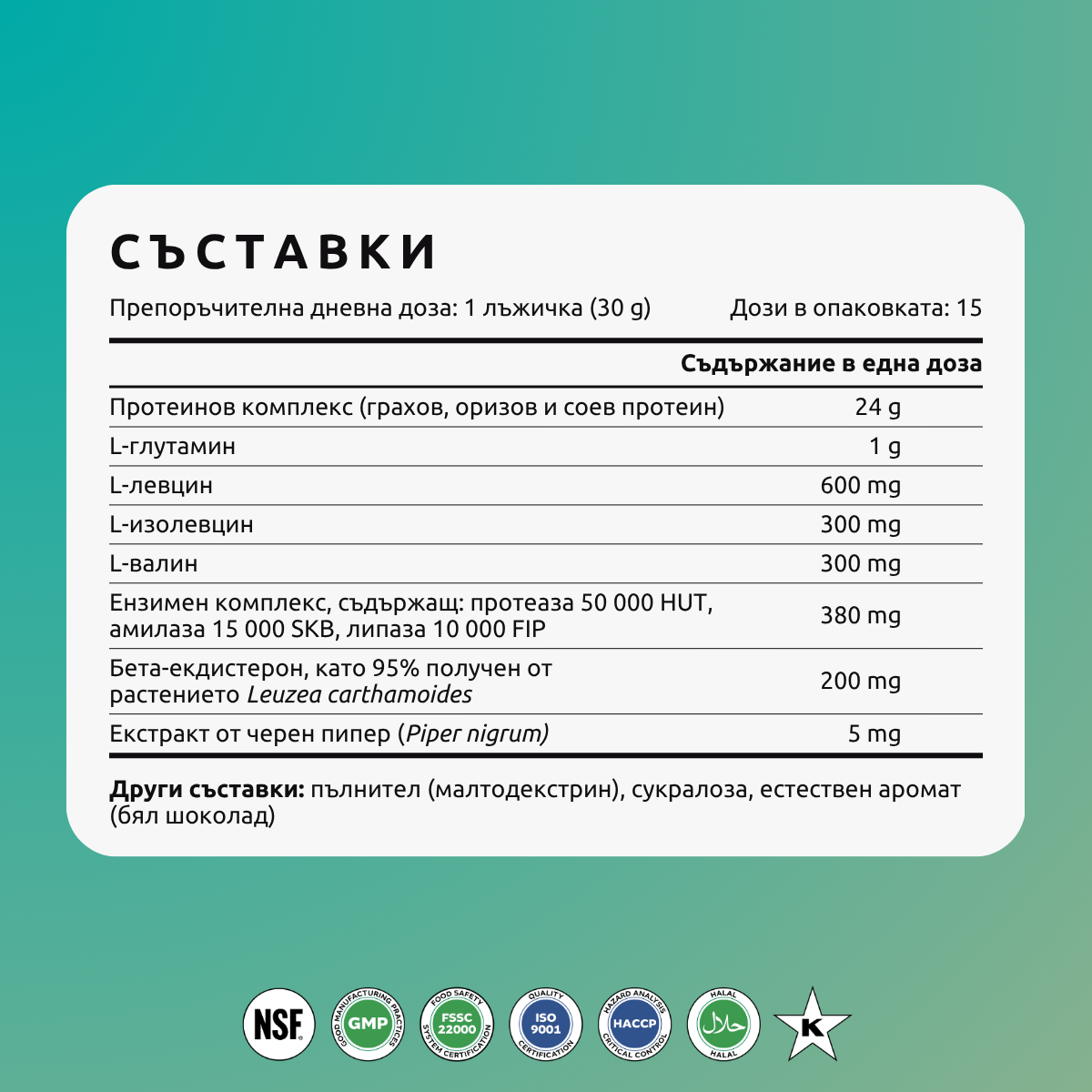 - Храносмилателни ензими (Специален ензимен комплекс, базиран на нашия дългогодишен професионален опит, за да гарантира максимално белтъчно усвояване);