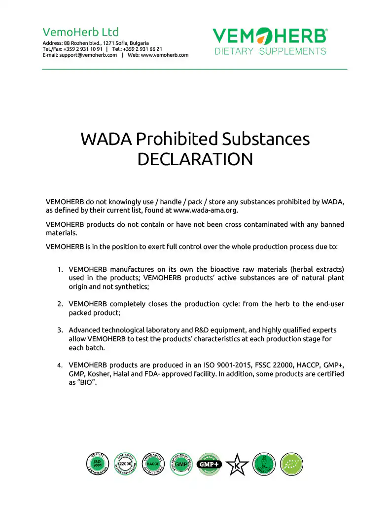 Es ist unser großer Vorteil, dass in den Produktionsanlagen und im Labor von VemoHerb nur natürliche Nahrungsergänzungsmittel hergestellt und getestet werden. Dies schließt die Möglichkeit einer versehentlichen Verunreinigung der Produkte mit unerwünschten chemischen Verbindungen aus. Nahrungsergänzungsmittel von VemoHerb sind 100 % dopingfrei.