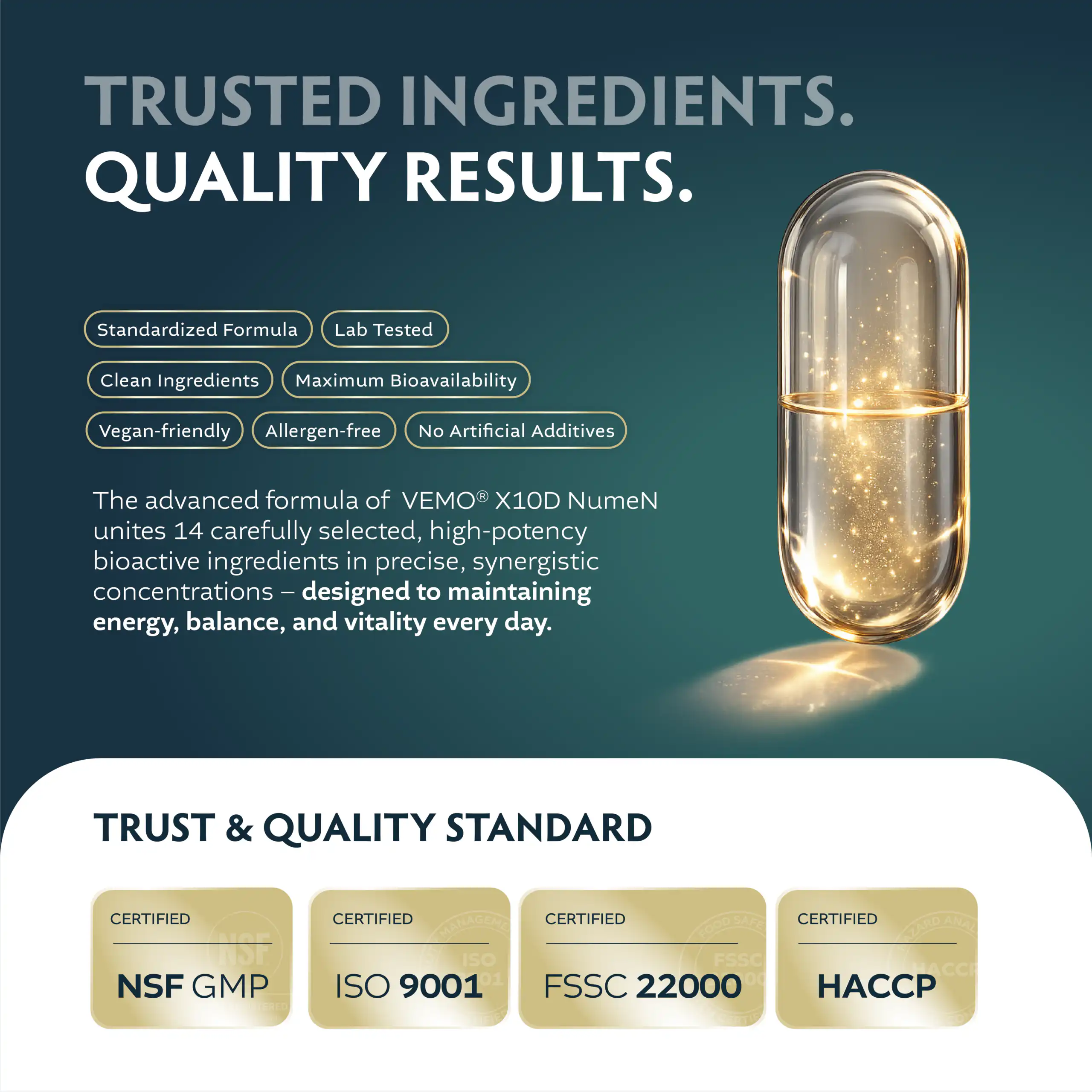 VEMO® X10D NumeN is a premium dietary supplement created to support the body’s most essential longevity pathways. This advanced formula unites 14 carefully selected, high-potency bioactive ingredients in precise, synergistic concentrations – designed to maintaining energy, balance, and vitality every day [15, 16].