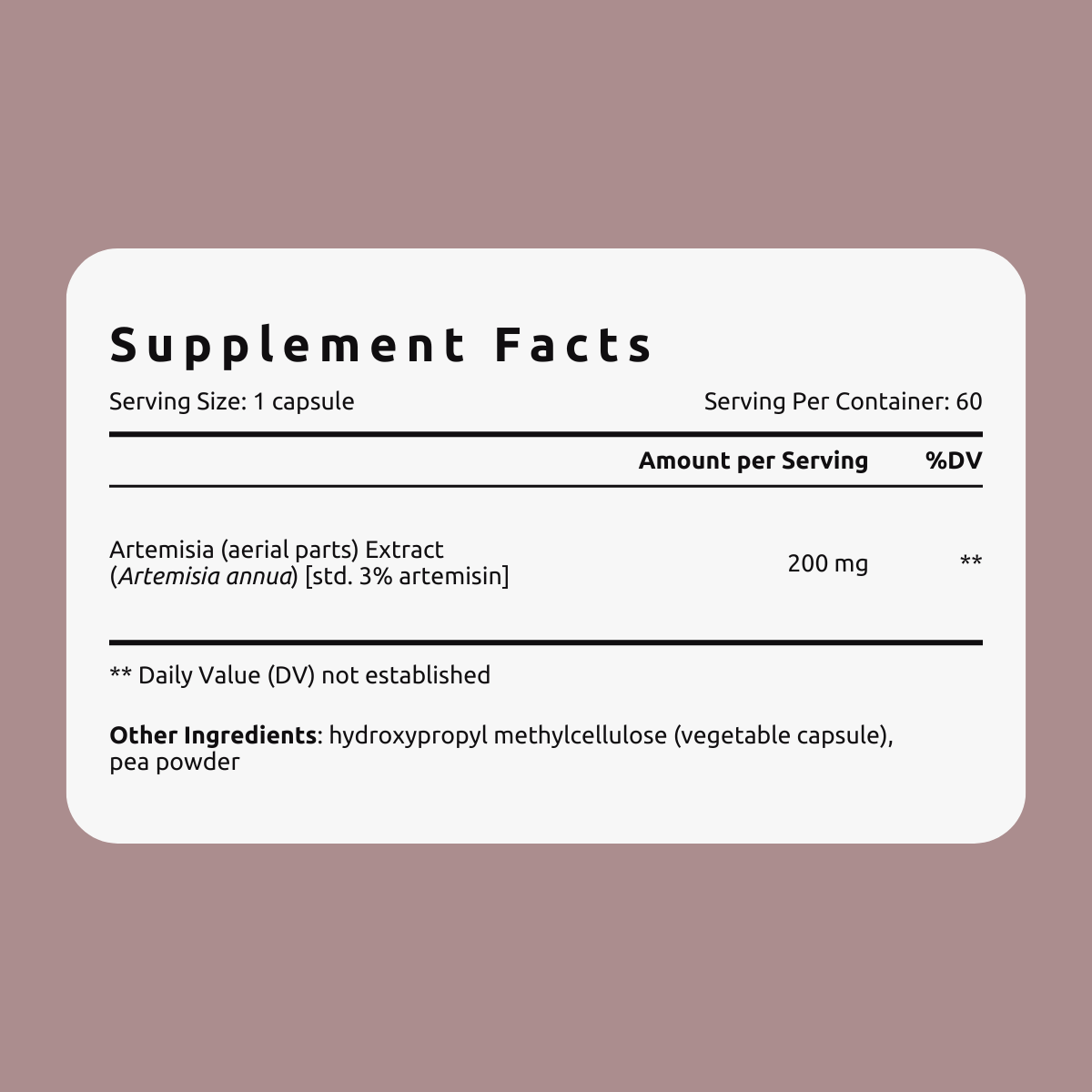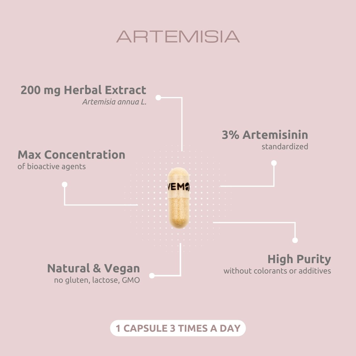 200 mg dry extract from Artemisia annua L., standardized at min 3% artemisinin