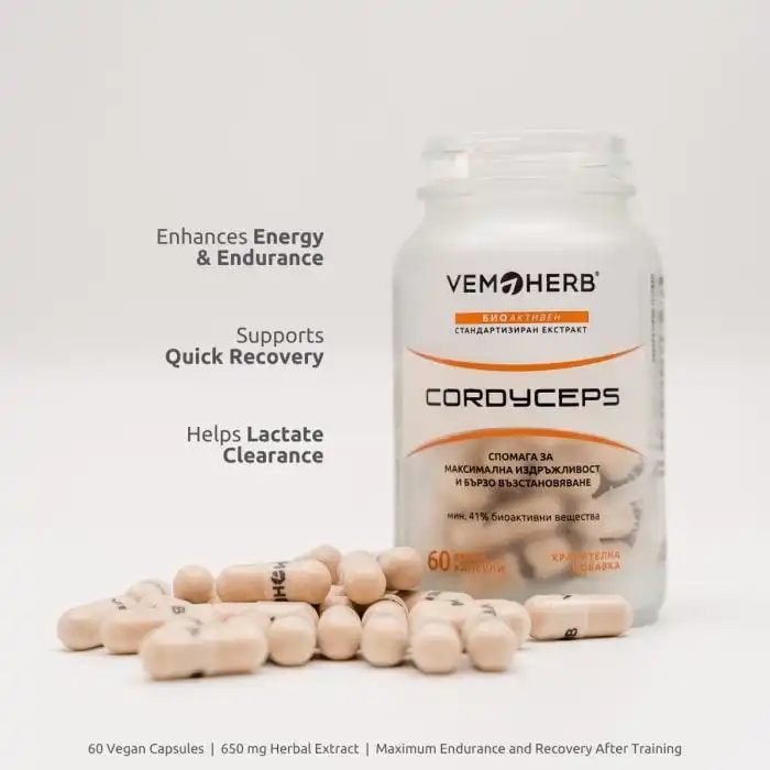VemoHerb® Cordyceps contains a dry extract from the edible mushroom Cordyceps sinensis CS-4, known for its adaptogenic properties and support for maximum endurance and recovery after training.