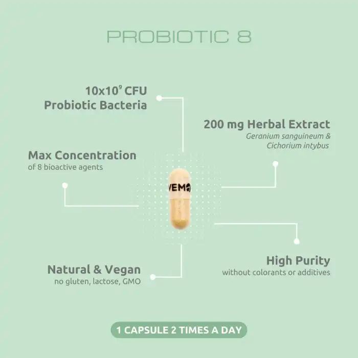 You can use VemoHerb® ProBiotiC 8 Immuno during this period, or immediately after it, since it supports the gut microflora and the normal functions of your liver.* [6,7,14]