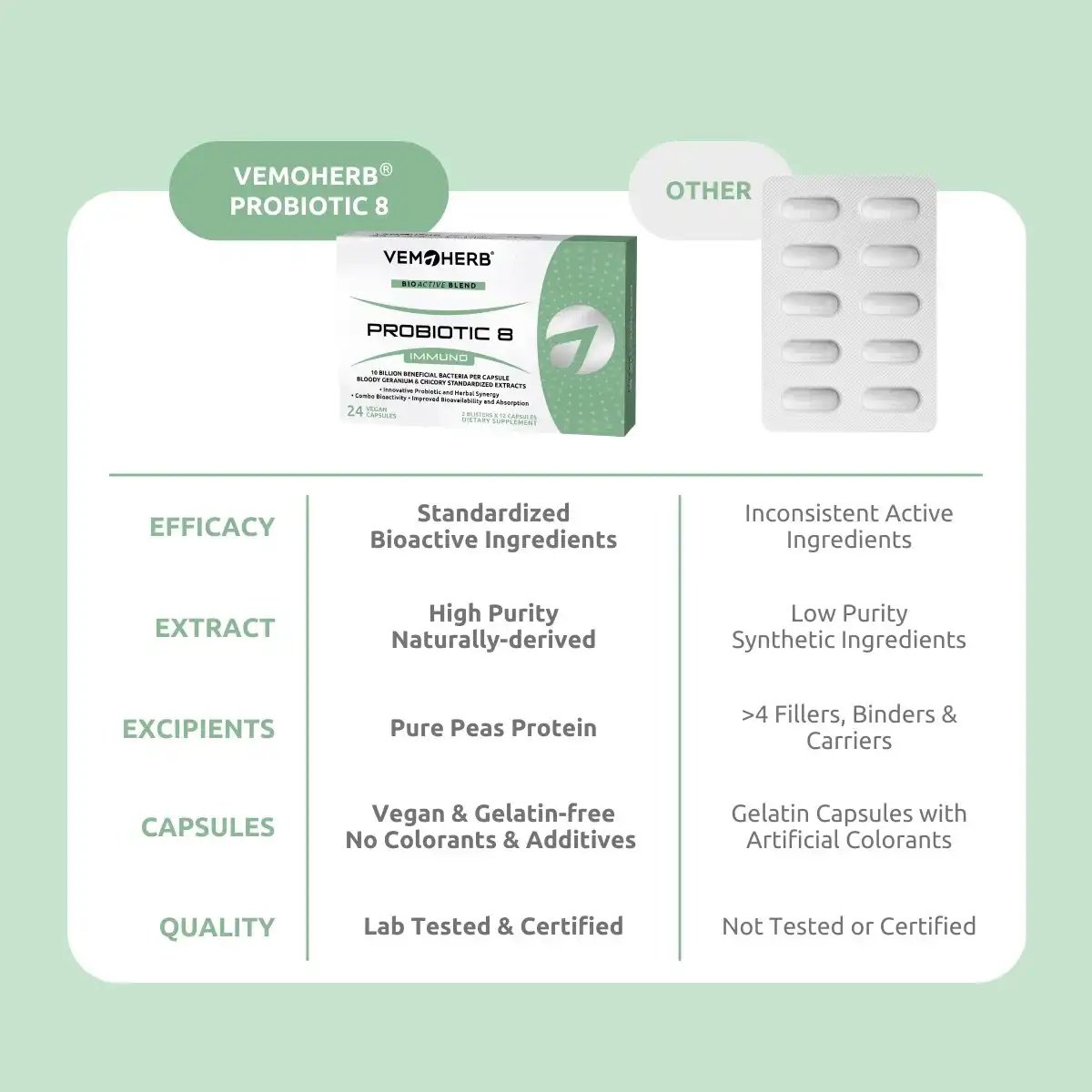 VemoHerb® ProBiotic 8 Immuno is a unique combination of probiotics (L.bulgaricus, S. thermophilus, Bifidobacterium longum, L. helveticus, L. acidophilus, L. rhamnosus) and herbal extracts from Geranium and Chicory, working in a perfect synergism, unlike most of the nutritional supplements that contain only one of these ingredients.
