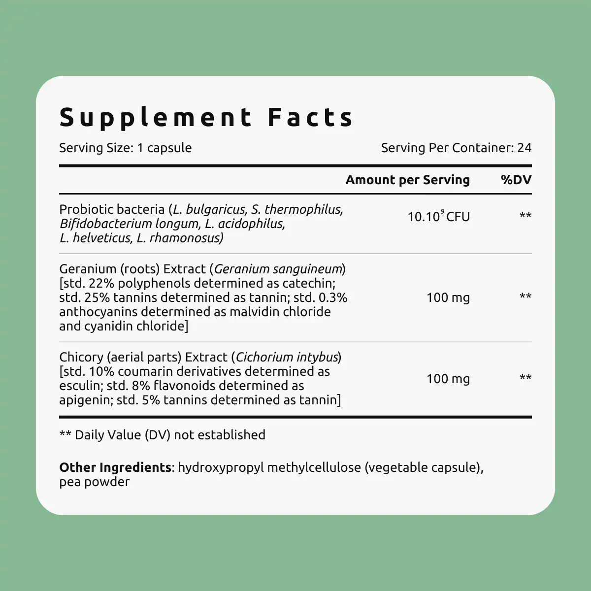 Bioactive blend of vegan Probiotics and standardized Geranium & Chicory extracts to support the immune system, promotes good digestion and helps maintain vitality*.