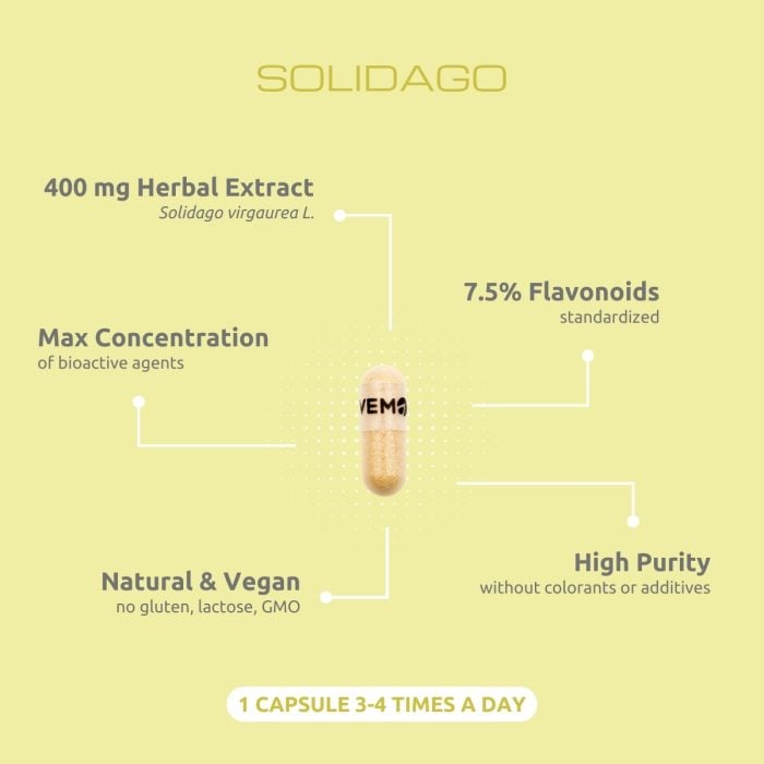 VemoHerb® Solidago contains herbal extracts from Solidago virgaurea L. (Goldenrod), widely used in traditional medicine to reduce pain and swelling (inflammation), to stop muscle spasms and treat eczema and other skin conditions.
