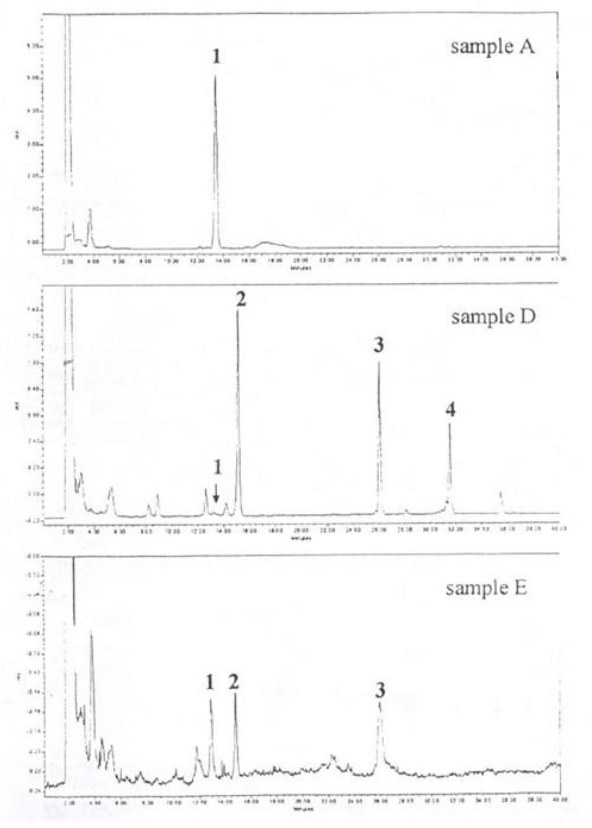 Figure 1. Chromatogram of different T. terrestris samples A: leaves from Bulgaria. D: stems from India, E: fruits from China separated by RP-HPLC column: Discovery C18, 5 µm particle size, 150, 4.6 mm; mobile phase: water acetonitrile, from 80 20 to 65 35 in 15 min to 20 80 in 20 min and held this composition for 5 min: flow rate: 1.0 mL min; detection: ELS; ELS parameters: 40 C. 2.4 bar nitrogen, gain of 9: injected sample volume: 10 µL, temperature: ambient. Assignment of peaks according to Figure 2.